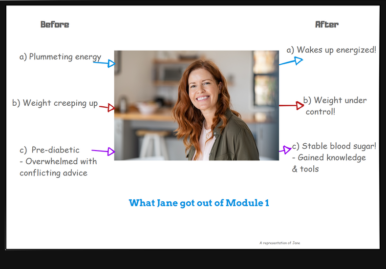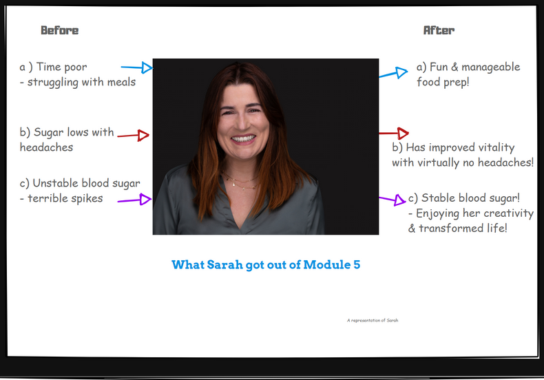 This module transformed her approach to food preparation, making it fun and manageable. With easy-to-follow recipes and practical tips, Sarah found herself enjoying the process of creating delicious, healthy meals. Now, she has more energy, her headaches are virtually gone, her blood sugar levels are stable, and her family loves the new dishes she prepares. Sarah's life has been transformed, and yours can be too.