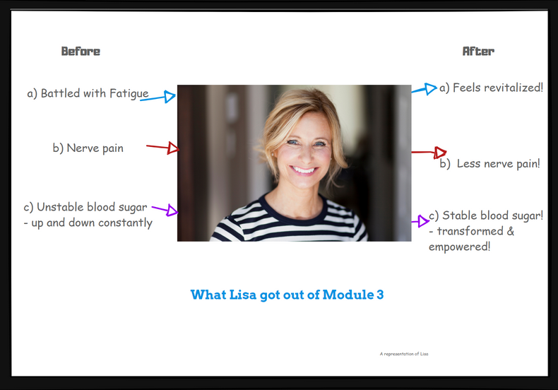 blood sugar stability. By implementing the strategies from this module, Lisa experienced a significant transformation. Her energy levels soared, her nerve