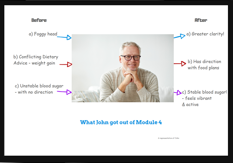 Everything changed when John enrolled in our Blood Sugar Mastery Course and reached Module 4. Here, he discovered how to tailor his diet to his specific